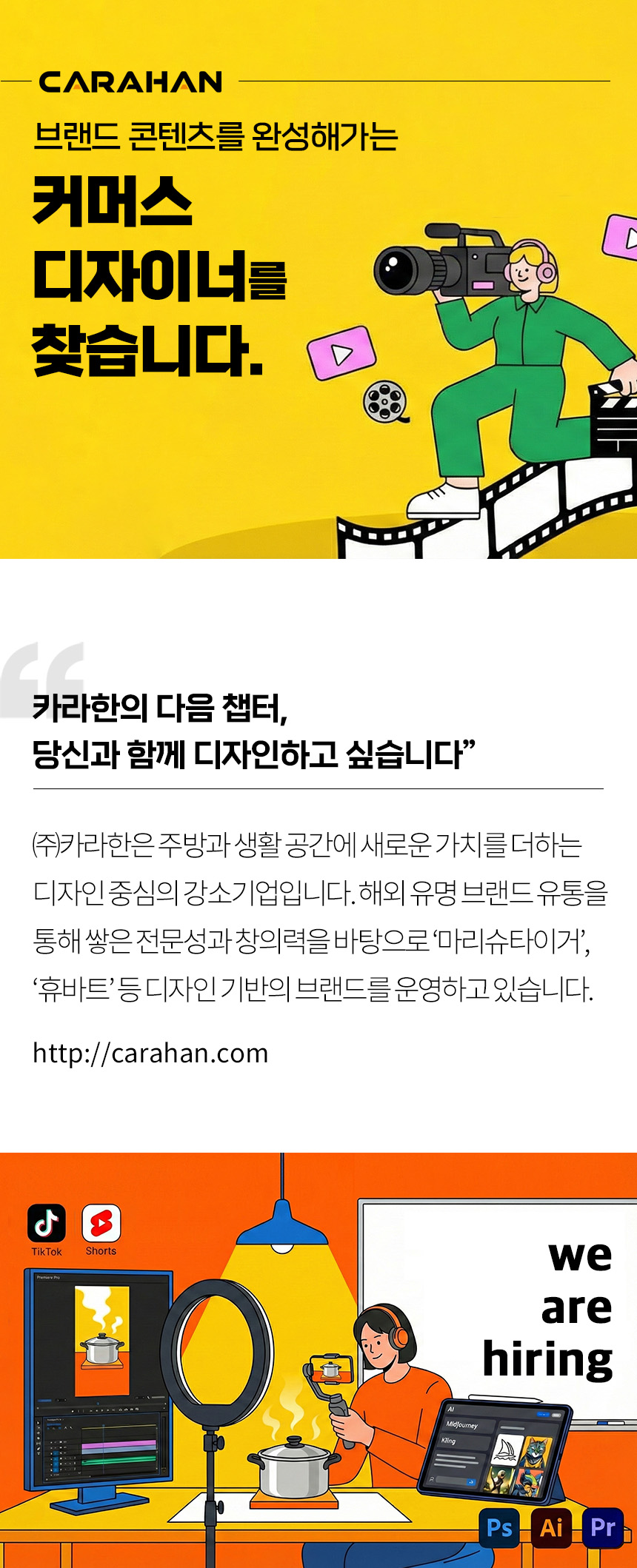 ㆍ숏폼 영상 콘텐츠를 직접 촬영·편집해본 경험이 있는 분 ㆍ기획, 연출, 편집 / 모션그래픽 제작이 가능한 분 ㆍ커머스 디자인 전반에 대한 이해가 있는 분 ㆍ팀 작업과 협업에 거부감 없이 유연하게 일할 수 있는 분 ㆍ타부서 업무지원 등 협조업무 문제가 없는 분