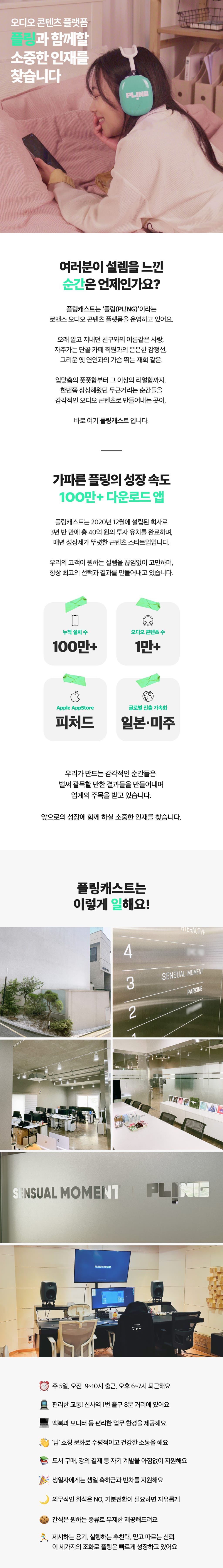 크리에이터를 아티스트이자 비즈니스 파트너로 보고 존중하며, 장기적인 성공 구조를 설계합니다. ◆ 크리에이터팀은 이렇게 일해요 크리에이터팀은 데이터와 실행을 기반으로 운영 방향을 제안하며, 크리에이터가 창작에만 집중할 수 있는 환경을 만드는 데 집중합니다. ◆지원 전 플링 앱을 꼭 살펴봐주세요! 플링 홈페이지 : https://www.plingcast.com/kr